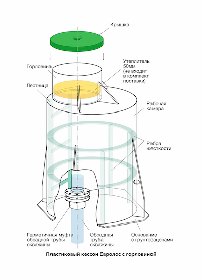 Если кессон поставляется вместе с герметичной муфтой Евролос для обсадной трубы скважины, то её необходимо предварительно разобрать. Для этого необходимо раскрутить все болтовые соединения, снять верхний фланец и уплотнительное кольцо. Обсадная труба скважины обрезается так, чтобы она выступала из бетонного основания не более чем на 500 мм. Пластиковый кессон необходимо поднести и сориентировать относительно приемной трубы в основании кессона. При опускании кессона обсадная труба скважины должна войти в приемную трубу герметичной муфты.